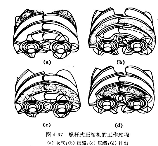陽轉子有四個齒,陰轉子有六條齒溝。當陽轉子及陰轉子回轉時,其嚙合部分在吸入口側逐轉脫開,齒與齒溝形成的基元容積逐步變大。由于該基元容積經吸入口與吸氣管相通,所以隨著基元容積的變大進行壓縮機的吸氣過程。當這個基元容積增大到最大時(即陽轉子的齒和陰轉子的齒溝完全脫開),轉子雖繼續(xù)回轉,基元容積也不變化。當基元容積繞過吸入口后,被端座封閉,與吸氣管隔開,成為一封閉容積,從而完成了吸氣過程。
