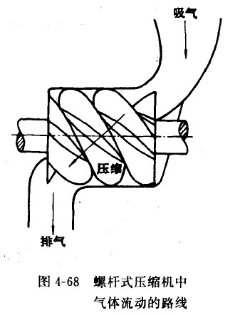 制冷劑蒸氣在螺桿式壓縮機(jī)中吸入和排出是在轉(zhuǎn)子的兩端進(jìn)行的。一般吸氣過(guò)程是在轉(zhuǎn)子的上半部分進(jìn)行,壓縮和排氣是在轉(zhuǎn)子的下半部分進(jìn)行,制冷劑蒸氣在壓縮機(jī)中內(nèi)流動(dòng)路線如圖4-68所示。