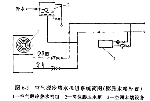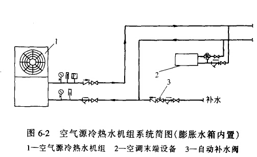 用于家用中央空調(diào)系統(tǒng)的空氣源冷熱水機組,室外主機一般由壓縮機、冷凝器、蒸發(fā)器、循環(huán)水泵組成。壓縮機分為定速和變速兩種。對于定速冷熱水機組,室內(nèi)負荷變化容易造成壓縮機頻繁起、停,因此系統(tǒng)中宜設(shè)蓄能水箱,或加大供、回水溫差的設(shè)定值。膨脹水箱分內(nèi)置和外置兩種,見圖6-2和圖6-3。系統(tǒng)補水方式與膨脹水箱的設(shè)置方式有關(guān)。對于冬季間歇運行,并且室外氣溫較低而致使系統(tǒng)容易結(jié)冰的地區(qū),可以將蒸發(fā)器及循環(huán)水泵與室外主機分開而組成室內(nèi)輔機。室內(nèi)輔機與室外主機用制冷劑管連接。在寒冷地區(qū),冬季室外溫度較低,根據(jù)夏季冷負荷選用的冷熱水機組,冬季供熱量常常不能滿足冬季熱負荷的要求,此時應(yīng)考慮選用輔助電加熱來增加供熱量。