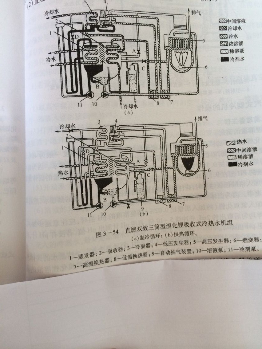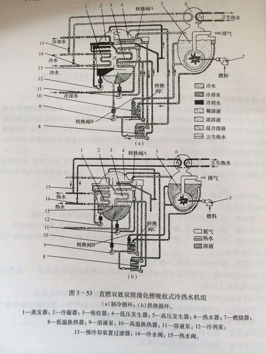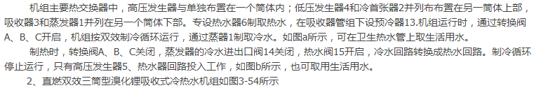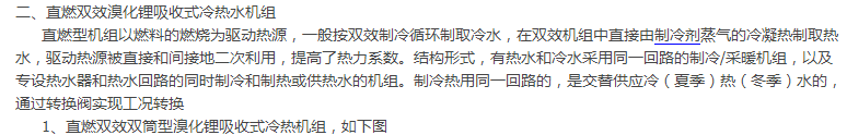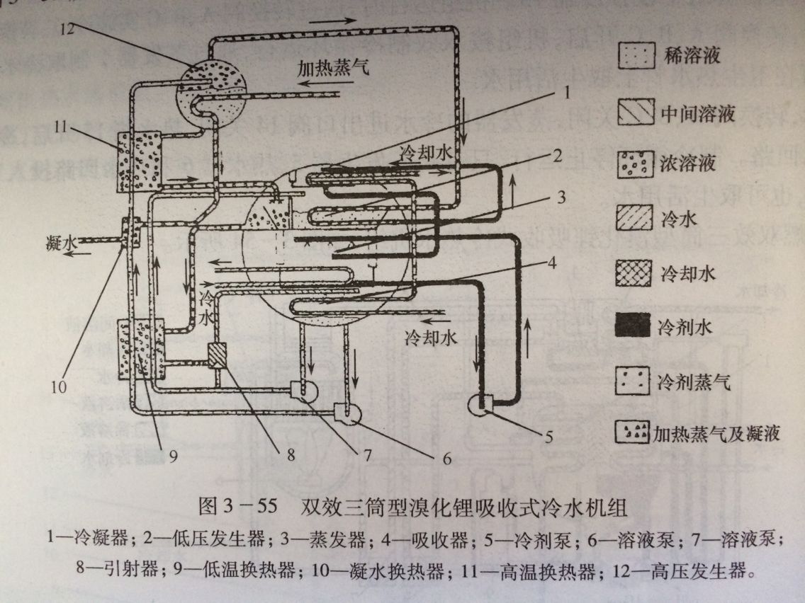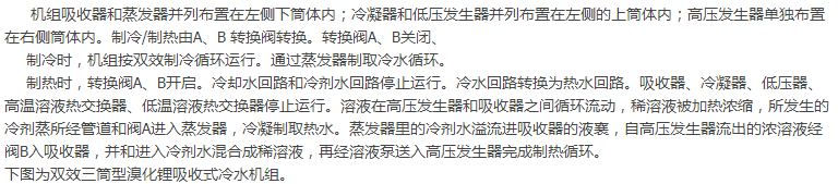 溴化鋰吸收式機(jī)組按循環(huán)形式有單效、雙效與兩級吸收機(jī)組之分。單效機(jī)組包括單效溴化鋰吸收式冷水機(jī)組、直燃型單效溴化吸收式冷熱水機(jī)組以及單效溴化鋰吸收式熱泵機(jī)組等。直燃型單效僅使用在制冷量35kW以下的冷熱水機(jī)組中,為節(jié)省燃料,目前已向直燃型雙效發(fā)展。雙效機(jī)組包括雙效溴化鋰吸收式冷水機(jī)組、直燃型雙效鋰吸收式冷熱水機(jī)組以及雙效溴化鋰吸收式熱泵機(jī)等