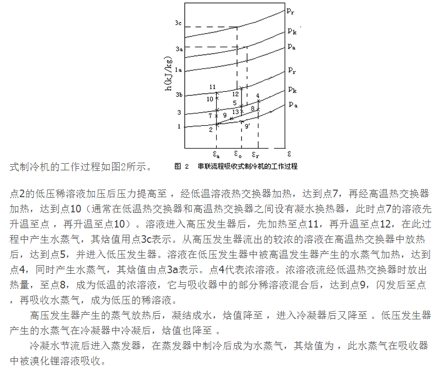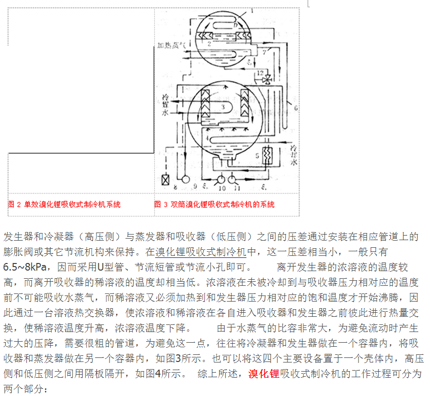 溶液的蒸氣壓力是對平衡狀態(tài)而言的。如果蒸氣壓力為0.85kPa的溴化鋰溶液與具有1kPa壓力(7℃)的水蒸氣接觸,蒸氣和液體不處于平衡狀態(tài),此時溶液具有吸收水蒸氣的能力,直到水蒸氣的壓力降低到稍高于0.85kPa(例如:0.87kPa)為止。