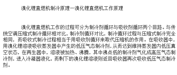 溴化鋰直燃機(jī),是目前世界上常用的吸收式制冷機(jī)組。溴化鋰直燃機(jī)是利用水為制冷劑,溴化鋰為吸收劑,來制冷、采暖和衛(wèi)生熱水的機(jī)組,多用于中央空調(diào)系統(tǒng)。