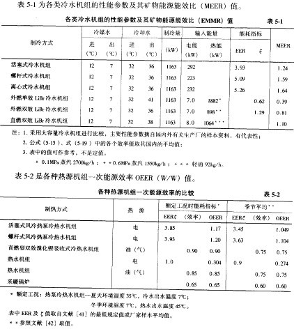 如果蒸汽壓縮式冷水機組和溴化鋰吸收式冷水機組耗用能均直接來自礦物能源,由表5-1中的值可知,應盡量利用礦物能源發(fā)電后驅動蒸汽壓縮式冷水機組才具有節(jié)能意義,大力推廣直接利用礦物燃料熱能的溴化鋰吸收式冷水機組對提高全國的能源利用率是不利的。同時伴隨著小型鍋爐的大量使用對環(huán)境產(chǎn)生污染,這也是一些電力供應充沛的國家極少使用溴化鋰吸收式冷水機組或者近幾年使用這類機組的數(shù)量逐漸有所下降的原因。