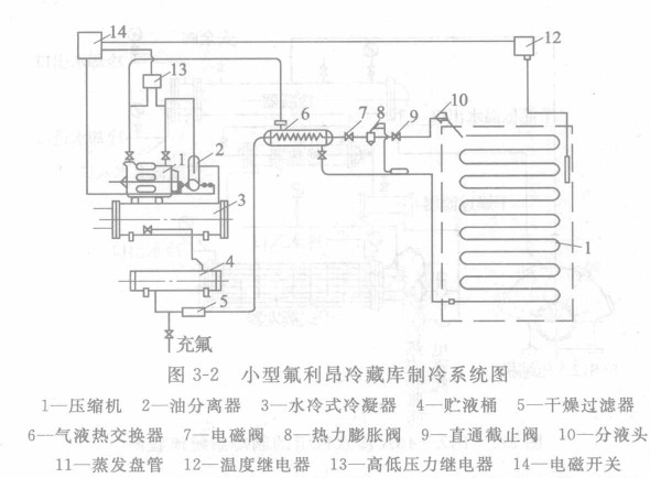 圖3-2為小型氟利昂冷藏庫(kù)的系統(tǒng)組成圖。壓縮機(jī)1從蒸發(fā)盤管11中吸氣,經(jīng)壓縮,進(jìn)入油分離器2,利用流速降低及離心力的原理和機(jī)械過濾的作用,將蒸氣中攜帶的油分離,然后進(jìn)入水冷冷凝器3,冷卻冷凝成飽和液體貯存在貯液桶4中,貯液桶除使高低壓(液封)隔開外,還能貯存液體和調(diào)節(jié)供液量。