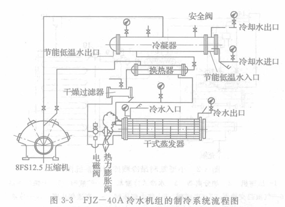 FJZ-40A冷水機(jī)組流程如圖3-3所示,由圖可見,R22在干式蒸發(fā)器內(nèi)蒸發(fā)后,由回氣管進(jìn)入壓縮機(jī)吸氣腔,經(jīng)壓縮機(jī)壓縮后變成高壓高溫蒸氣,然后進(jìn)入冷凝器中冷凝,冷凝后的制冷劑液體,進(jìn)入換熱器被從蒸發(fā)器來的回氣過冷,再經(jīng)過干燥過濾器和電磁閥進(jìn)入熱力膨脹閥,經(jīng)節(jié)流降壓后進(jìn)人蒸發(fā)器,在蒸發(fā)器中吸收冷水熱量后,又重新進(jìn)入壓縮機(jī),如此循環(huán)不已。