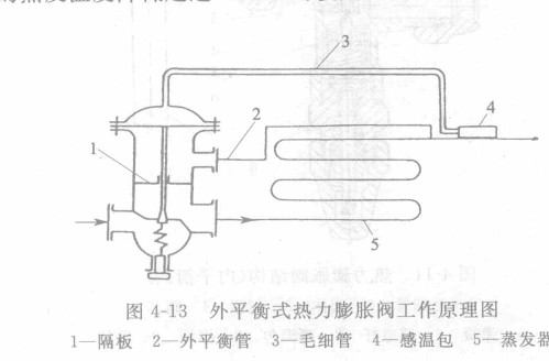其工作原理如圖4-13所示在蒸發(fā)器阻力較大時(shí),可選用此閥。它與內(nèi)平衡熱力膨脹閥不同之處是,在膜片下設(shè)有隔板與閥的進(jìn)口隔開(kāi),在膜片與隔板間有一個(gè)外平衡接口,膜片下部空間通過(guò)一根毛細(xì)管與蒸發(fā)器出口相連,這樣作用于膜片下的壓力是蒸發(fā)器出口壓力,因而膜片上下的壓差能夠反映制冷劑在蒸發(fā)器出口的實(shí)際過(guò)熱度因此,當(dāng)蒸發(fā)器內(nèi)有較大壓力降或蒸發(fā)器管路較長(zhǎng)時(shí),可選用外平衡式熱力膨脹閥,或以膨脹閥出口至蒸發(fā)器出口的蒸發(fā)溫度降低超過(guò)2~3℃時(shí)使用此閥。