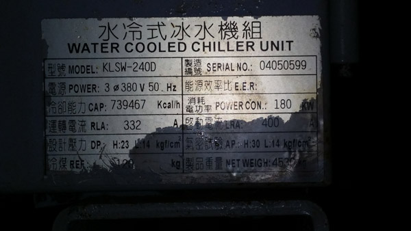 堃霖水冷式冰水機(jī)組,型號:KLSW-240D 制冷量:74萬大卡 功率:180KW 啟動電流: 400A 重量:4530KG 生產(chǎn)日期:2003年 臺灣原裝進(jìn)口。