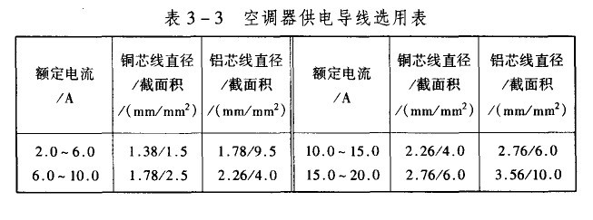 空調(diào)器安裝時(shí)對(duì)電源導(dǎo)線規(guī)格的要求??照{(diào)器使用中的工作電流是較大的,啟動(dòng)時(shí)的電流則更大,是額定電流的5倍-7倍。一臺(tái)KC- 30型空調(diào)器工作電流在6.25A左右,如果是電熱型的KCD - 30型空調(diào)器,所配的電加熱元件均為3000W,當(dāng)電加熱元件工作時(shí),工作電流可達(dá)7.5A。而一般家庭住房?jī)?nèi)的導(dǎo)線,均為照明線,最大允許電流不起過(guò)5A,如果將空調(diào)器接在這樣的導(dǎo)線上,很快會(huì)使導(dǎo)線過(guò)熱燒毀,甚至引發(fā)火災(zāi)。所以用戶在不清楚室內(nèi)導(dǎo)線負(fù)荷的情況下決不能將空調(diào)器接在這種導(dǎo)線上。按空調(diào)器性能要求,空調(diào)器的供電線必須三芯動(dòng)力線,而且得專線供電。這是因?yàn)榭照{(diào)器的正常工作與電源的電壓變化有關(guān),為保證空調(diào)器處于正常工作長(zhǎng)期條件,不受其他電器使用的干擾,也為了不因空調(diào)器運(yùn)行時(shí)壓縮機(jī)頻繁啟停而對(duì)其他電器產(chǎn)生干擾,一般都要求空調(diào)器的用電電源直接從電表中分出獨(dú)立的一路線路,并獨(dú)立使用一路熔斷絲或熔斷器??照{(diào)器電源線截面選用如表3-3所示。