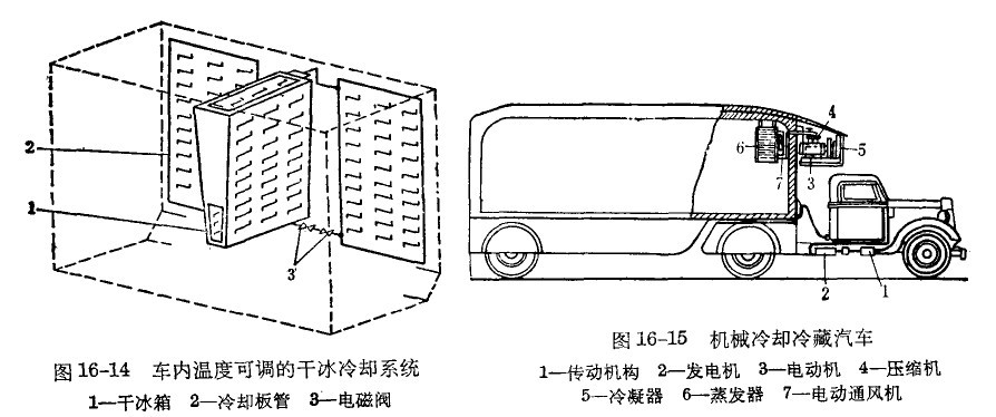 冷藏汽車采用冰冷卻時(shí)可以用水冰,也可以用干冰。用水冰時(shí)是在車廂兩側(cè)的上方裝兩個(gè)可拆卸的三角形箱子,內(nèi)部可裝冰或冰鹽,只要定期將箱子拆下,將其中的水或冰鹽倒出,重新裝入冰或冰鹽即可。冰冷冷藏汽車每次裝入的冰有限,故只能用于短途運(yùn)輸。當(dāng)用千冰時(shí)可以用干冰箱,亦可將干冰直接放在凍結(jié)食品垛上,但這種方法車內(nèi)溫度難以控制。為了克服這個(gè)缺點(diǎn),現(xiàn)在設(shè)計(jì)出一種車內(nèi)溫度可調(diào)的干冰冷卻系統(tǒng),圖16-14即為這種系統(tǒng)的示意圖。裝干冰的金屬板箱1用管道與冷卻板管2相連接,管內(nèi)通以氟利昂在1和2之間循環(huán)吸收熱量,氟利昂的循環(huán)量用電磁閥3自動(dòng)調(diào)節(jié)。干冰冷卻比較經(jīng)濟(jì)適于長途運(yùn)送凍結(jié)食品。