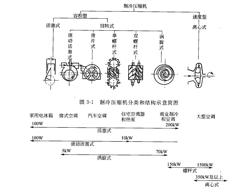 圖3-1所示為制冷壓縮機(jī)分類及其結(jié)構(gòu)示意簡圖。圖3-2表示了目前各類制冷壓縮機(jī)的大致應(yīng)用范圍及其制冷量大小。