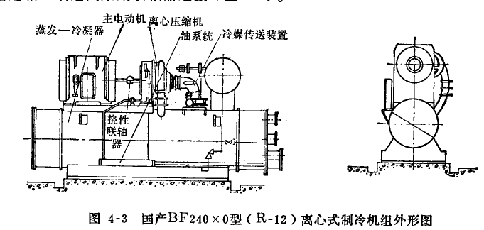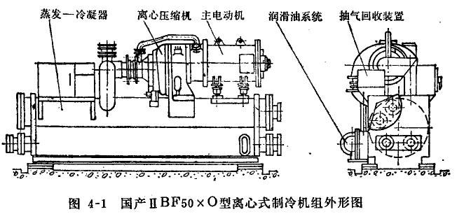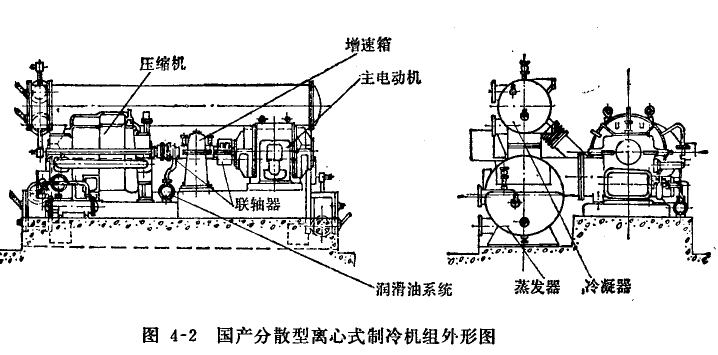增速裝置外裝式,是指機(jī)組中的增速箱與壓縮機(jī)、主電動(dòng)機(jī)各自分開,其間采用聯(lián)軸器連接。這種型式見于早期的分散型空調(diào)用離心式制冷機(jī)組中,如圖4-2所示外形圖。