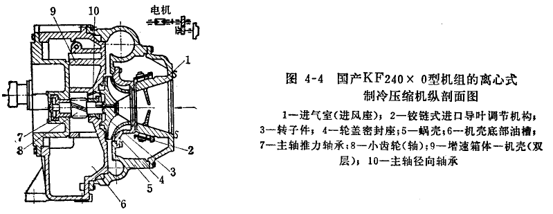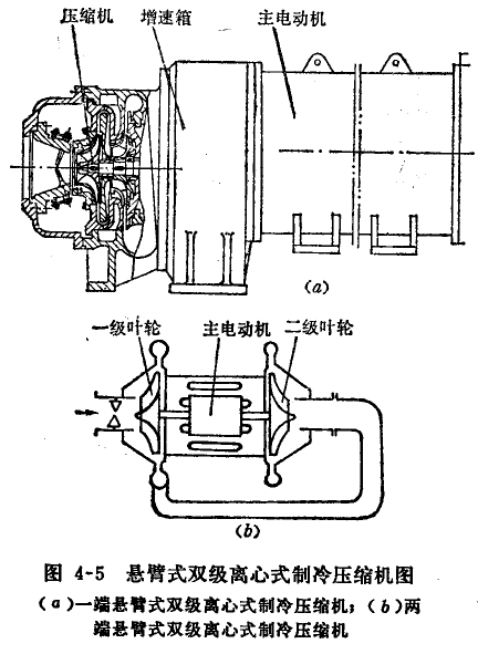單級(jí)壓縮式是將單級(jí)離心式制冷壓縮機(jī)、增速裝置、主電動(dòng)機(jī)裝在所聯(lián)接的封閉殼體之內(nèi)(圖4-4)。