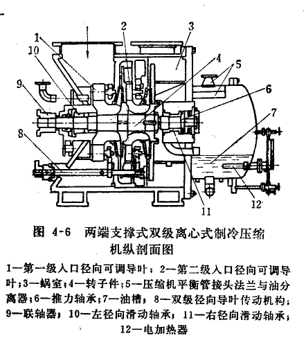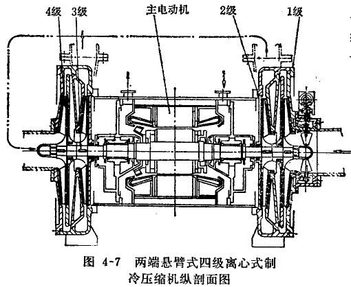 兩端懸臂式無增速裝置,兩級(jí)葉輪分別掛在主電動(dòng)機(jī)軸兩端,兩級(jí)間有管路相通。由于壓縮機(jī)與主電動(dòng)機(jī)轉(zhuǎn)速同步,轉(zhuǎn)速較低。圖4-7為兩蠟懸臂式四級(jí)離心式制冷壓縮機(jī)縱剖面圖。