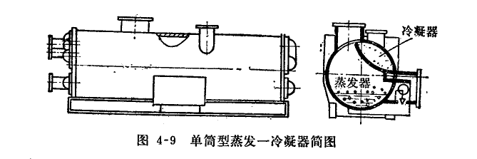 將蒸發(fā)器和冷凝器布置在同一筒體內(nèi),稱為單筒型蒸發(fā)一冷凝器。冷凝器位于上方,蒸發(fā)器位于下半部,其間有圓弧隔板分開。浮球閥室(節(jié)流裝置)位于筒體縱向中部下方。