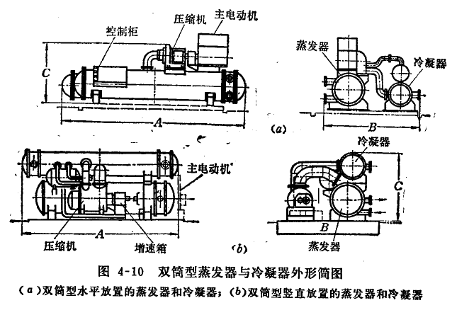 當(dāng)機(jī)組制冷量太小時(shí),出于工藝制造上的困難,常做成雙筒型。蒸發(fā)器和冷凝器各一個(gè)筒體,采取上下或橫排安裝方式。目前空調(diào)用機(jī)組上,國外仍有廠家采用。但在相互有絕熱要求的低溫離心式制冷機(jī)組中廣泛使用。