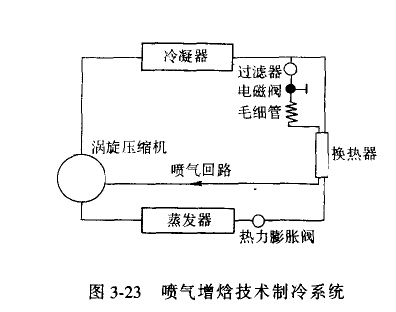 圖3-23所示的制冷系統(tǒng),在冷凝器出口處旁通一段毛細(xì)管,并加設(shè)一控制電磁閥,向兩級(jí)容量渦旋壓縮機(jī)(開(kāi)設(shè)旁通孔)內(nèi)引射制冷劑低壓蒸氣,可有效地在空調(diào)機(jī)組處于極端炎熱和寒冷的工況時(shí),類似于“經(jīng)濟(jì)器”的辦法,提高壓縮機(jī)的質(zhì)量流量,冷卻壓縮機(jī)的渦旋盤,保證壓縮機(jī)的可靠性。按美國(guó)谷輪公司介紹,采用“噴氣增焓”技術(shù)的渦旋壓縮機(jī),可增加30%~40%的制冷量,及15%的性能系數(shù)(COP值)。圖3-24所示為噴氣增焓技術(shù)的示意圖。