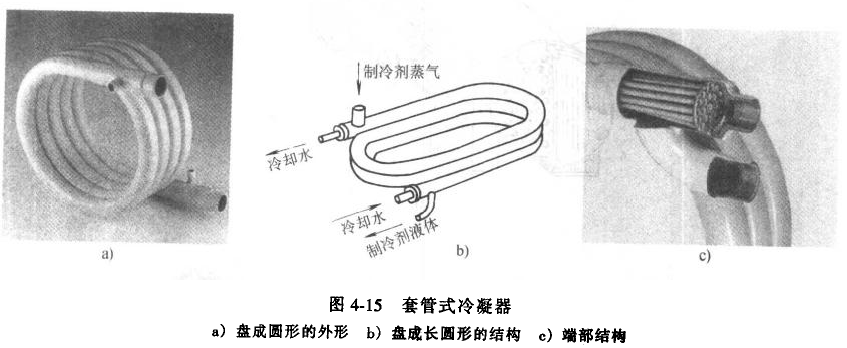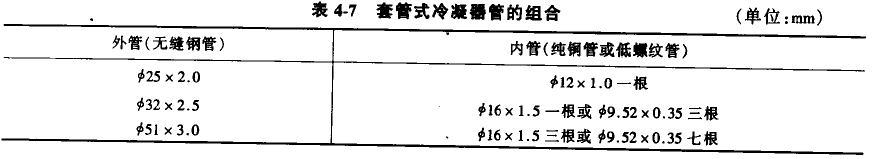 由無(wú)縫鋼管作外管,由一根或三根以上純銅傳熱管作內(nèi)管穿入其中后,盤成圓形或長(zhǎng)圓形的套管式冷凝器如圖4-15a、b所示。外管與內(nèi)管的組合尺寸見表4-7。更大的甚至有二十根左右的內(nèi)管見圖4-15c。