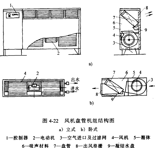 風機盤管是冷/熱水中央空調(diào)必備的末端裝置,它裝在房間內(nèi),也有明裝、暗裝、臥式、立式等多種形式,圖4-22是其中的立式、臥式結(jié)構(gòu)圖。圖中風機不斷地對房間內(nèi)的空氣進行循環(huán),迫使空氣流過盤管7的管外側(cè),而制冷機組產(chǎn)生的冷/熱水受迫流過管內(nèi),對空氣進行冷卻或加熱,進而維持了房間內(nèi)的溫度。