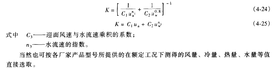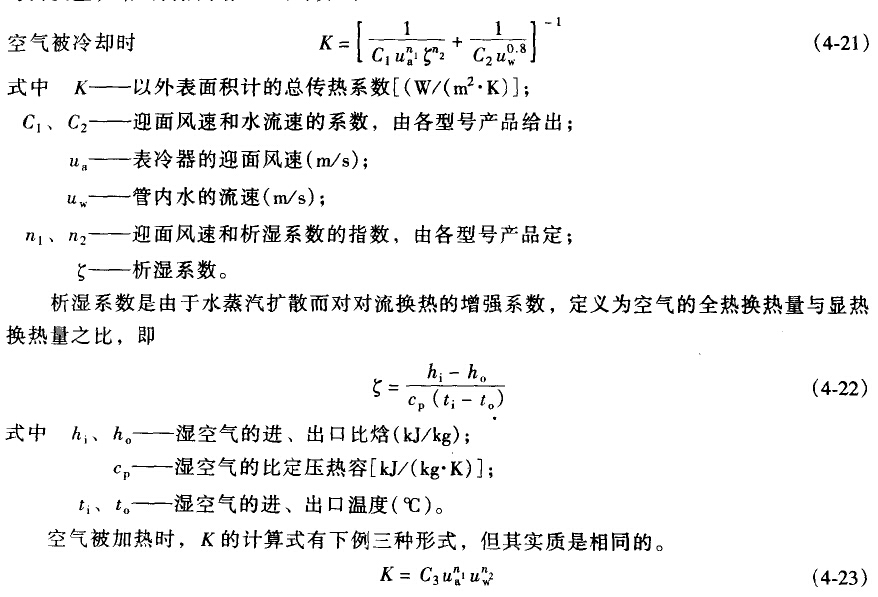 風機盤管式換熱器的管排數(shù)、管徑、翅片尺寸等品種變化較多,為較準確地給出各風機盤管的傳熱性能,各廠家對自己的產(chǎn)品進行測試,以對傳熱性能影響強烈的管內(nèi)外流體流速等為變量,給出傳熱系數(shù)K的計算式。