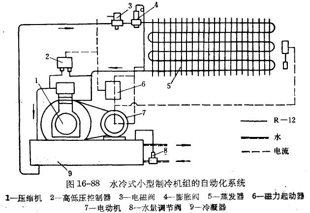 圖16-88所示為只用于一個房間的小型機組的自動化系統(tǒng)。機組中使用水冷式冷凝器兼作為貯液器,應用冷卻空氣的蒸發(fā)器,供液量用熱力膨脹閥調(diào)節(jié)。由于膨脹閥在壓縮機停機時不能及時關閉,因此在膨脹閥前串聯(lián)—電磁閥,使得停機后液體不再繼續(xù)進入蒸發(fā)器,這樣可以避免壓縮機再次起動時發(fā)生液擊。電磁閥的電路與磁力起動器連在一起,兩者同時受溫度控制器控制。當被控的溫度升高到調(diào)定值上限時,電動機與電磁閥同時工作;而當溫度降到調(diào)定值的下限時,兩者同時停止工作。機組還裝有高低壓壓力控制器,其電路與磁力起動器接通(若再采用油壓差控制器時,其電路亦與磁力起動器接通)。機組中還采用自動水量調(diào)節(jié)閥以調(diào)節(jié)冷凝溫度,在低負荷時可節(jié)省冷卻水的消耗量。