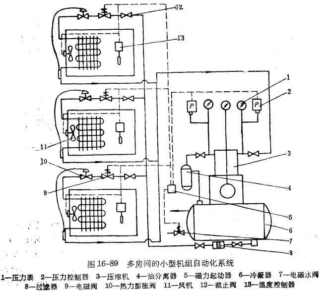 圖16-89所示的是用于三個房間的小型機組的自動化系統(tǒng),每個房間均裝有一個溫度控制器,當房間溫度升到調(diào)定值上限時,開啟本房間的電磁閥和風機,降到下限時關閉。三個溫度控制器均與壓縮機的磁力起動器連接,當三個房間的溫度都降到調(diào)定值下限時,壓縮機停止運轉(zhuǎn);而當其中一個房間的溫度上升到上限時,則電動機再次運轉(zhuǎn)。電磁水閥與壓縮機同步。機組裝有高壓與低壓控制器作為壓縮機安全保護。