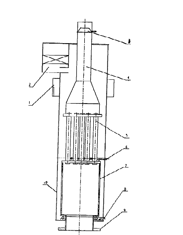 此直立底吹式溴化鋰制冷機(jī)用直燃高壓發(fā)生塔,屬制冷設(shè)備技術(shù)領(lǐng)域。 它包括:高發(fā)筒體(10)、爐筒(7)、爐門(9)、換熱管束(5)、煙囪(4)、布液管11(6)、布液管1{8)、液囊(1)和汽包(2),直燃高壓發(fā)生器直立布置,采用濕式、火管結(jié)構(gòu):所述的高發(fā)筒體(10)直立布置,爐筒(7)與換熱管束(5)下管板直接連接同軸直立布置于高發(fā)筒體(10)下部;換熱管束(5)上管板與煙囪(4)相連;布液管Ⅱ(6)布置在爐簡(7)底部與爐門(9)筒連接處,另一布液管1(8)布置在正對換熱管束(5)下管板處,液囊(1)環(huán)設(shè)于高發(fā)簡體(10)上部外同,汽包(2)設(shè)置于液囊(1)上方的高發(fā)筒體(10)筒壁,液囊(1)與汽包(2)均與高發(fā)筒體(10)相連通。 本實用新型體積小、重量輕、效率高,安全可靠,可應(yīng)用在小型溴化鋰吸收式直燃機(jī)組中。