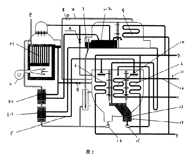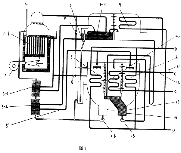 圖1中,直燃高壓發(fā)生器1-1、燃燒器2、高溫?zé)峤粨Q器3-1、低溫?zé)峤粨Q器3-2、吸收器進(jìn)液管5、吸收器6、融晶管7、低壓發(fā)生器1-2、冷凝器9、蒸發(fā)器10、冷水出口溫度傳感器11、冷水出口管12、冷劑水液囊13、冷劑水溫度傳感器14、冷劑泵15和溶液泵16。