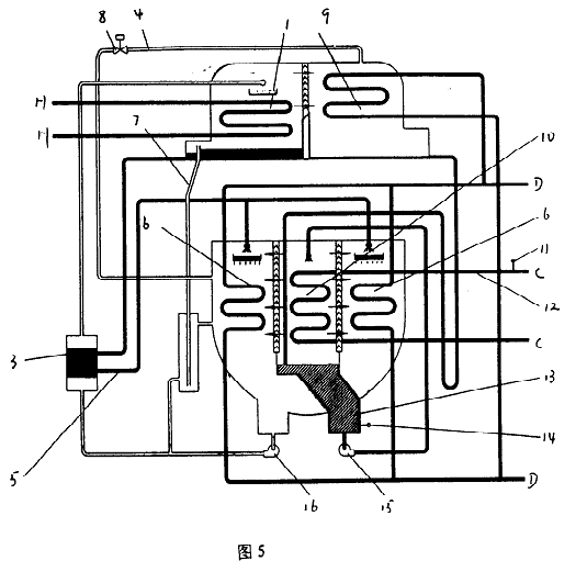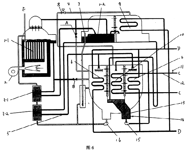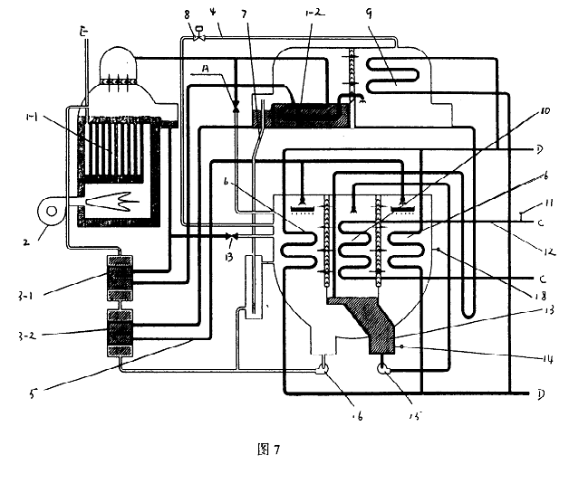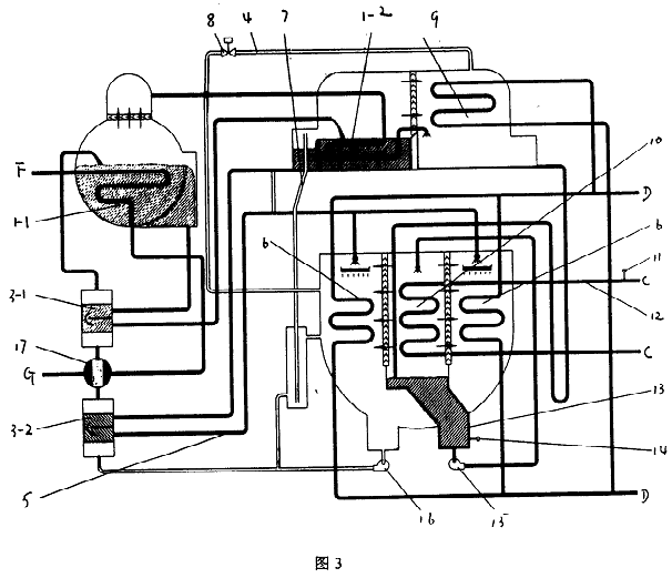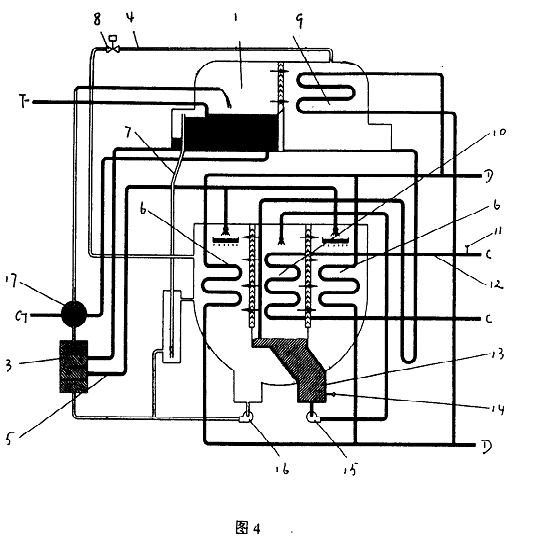 帶有冷劑蒸汽調(diào)控防凍裝置的溴化鋰吸收式制冷機(jī),包括發(fā)生器(1)、蒸發(fā)器(10)、吸收器(6)、冷凝器(9)、熱交換器(3)、溶液泵(16)、冷劑泵(15)、控制系統(tǒng)及連接各部件的管路、閥,所述的溴化鋰吸收式制冷機(jī)為直燃型溴化鋰吸收式冷水、冷熱水機(jī)組或蒸汽雙效型溴化鋰吸收式冷水機(jī)組、蒸汽單效型溴化鋰吸收式冷水機(jī)組、熱水單效型溴化鋰吸收式冷水機(jī)組,其特點(diǎn)是存冷凝器(9)與吸收器(6)或蒸發(fā)器(10)之間設(shè)置冷劑蒸汽連通管(4),連通管(4)上裝有電動閥(8),構(gòu)成防凍裝置。 電動閥開啟時將冷凝器中的冷劑蒸汽按調(diào)節(jié)控制要求輸入吸收器或蒸發(fā)器。使機(jī)組的冷水出口溫度和冷劑水溫度迅速停止下降并回升,在任何運(yùn)行條件下都能防止機(jī)組結(jié)冰凍管。
