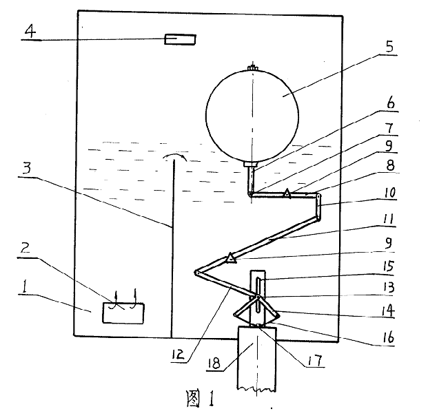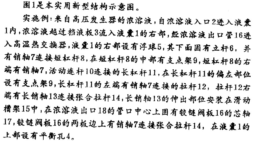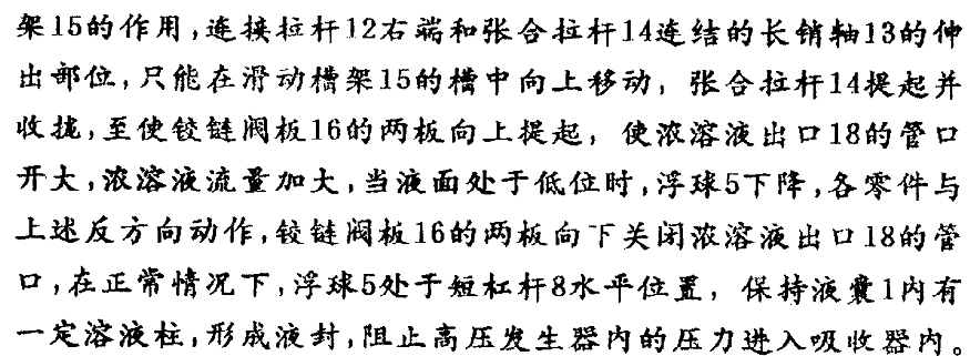 溴化鋰制冷機(jī)濃溶液自動節(jié)流裝置,其特征是:在液囊1內(nèi)設(shè)有浮球5、立桿6、銷軸7、短杠桿8、支點(diǎn)架9、活動連桿10、長杠桿11、拉桿12、長銷軸13、張合拉桿14、滑動槽架15、鉸鏈閥板16、芯軸17、濃溶液出口18構(gòu)成。本裝置的特點(diǎn)是:利用浮球控制上、下液位,通過多層次連桿、杠桿、拉桿開啟或閉合鉸鏈閥板,調(diào)整濃溶液出口流量,達(dá)到自動節(jié)流效果,安全可靠,安裝定位后,不需人工調(diào)試,適用于各種溴化鋰制冷機(jī)組。