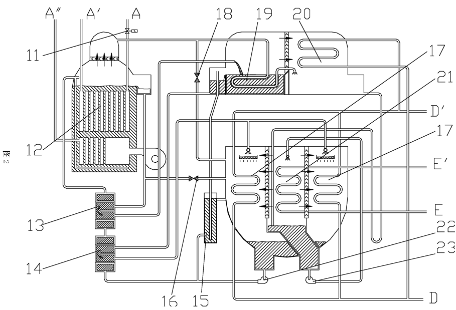 以往的技術(shù)如圖1所示的補(bǔ)燃發(fā)生器,該補(bǔ)燃發(fā)生器是將余熱煙氣傳熱管束2、補(bǔ)燃煙氣傳熱管束8和爐筒9設(shè)置在同一個(gè)筒體7內(nèi),余熱煙氣傳熱管束和補(bǔ)燃煙氣傳熱管束均采用直立水管式結(jié)構(gòu),即煙氣走管外,溶液6及其被加熱時(shí)所產(chǎn)生的蒸汽走管內(nèi)。配置該補(bǔ)燃發(fā)生器的排熱利用型溴化鋰吸收式制冷機(jī)組如圖2所示,該機(jī)組為冷熱水型機(jī)組,可按制冷工況或制熱工況運(yùn)行,提供空調(diào)或工藝用冷水、熱水。機(jī)組的余熱煙氣進(jìn)口管上裝有煙氣電動(dòng)調(diào)節(jié)閥11,用于控制加熱負(fù)荷或切斷加熱煙氣。機(jī)組運(yùn)行時(shí),煙氣電動(dòng)調(diào)節(jié)閥開啟,其開度由機(jī)組的控制系統(tǒng)根據(jù)制冷(熱)負(fù)荷自動(dòng)調(diào)節(jié)控制。機(jī)組停運(yùn)時(shí),煙氣電動(dòng)調(diào)節(jié)閥關(guān)閉。由于結(jié)構(gòu)上的原因,煙氣電動(dòng)調(diào)節(jié)閥關(guān)閉時(shí)難以做到全密封,會(huì)有余熱煙氣漏入補(bǔ)燃發(fā)生器12,加熱其中的溴化鋰溶液,使溶液中的水分不斷蒸發(fā)轉(zhuǎn)移到機(jī)組的低壓發(fā)生器19、冷凝器20等部件內(nèi),導(dǎo)致補(bǔ)燃發(fā)生器中的溴化鋰溶液濃度不斷升高,直至結(jié)晶,從而導(dǎo)致機(jī)組發(fā)生停機(jī)結(jié)晶故障。