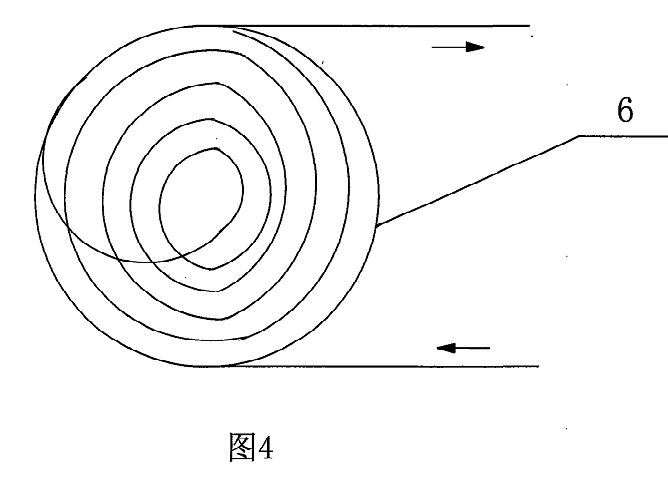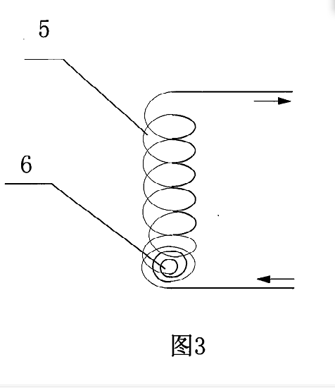本實(shí)用新型螺旋管增效蒸發(fā)器的示意圖如圖3和圖4所示,蒸發(fā)器由水平盤(pán)繞的螺旋管6和垂直盤(pán)繞的螺旋管5連接而成。水平盤(pán)繞的螺旋管盤(pán)好后為盤(pán)香管狀。所述垂直盤(pán)繞的螺旋管為直筒狀。