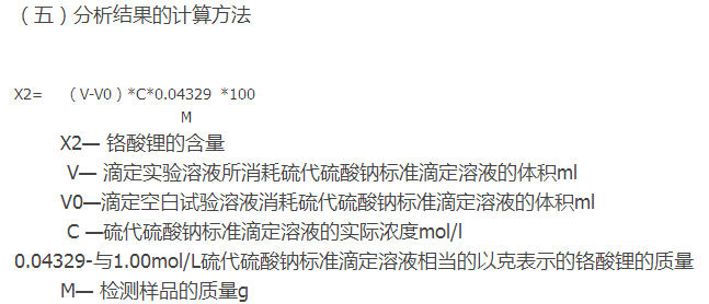 在酸性條件下,鉻酸鋰轉(zhuǎn)換為重鉻酸根,將KI氧化為I2,用淀粉作指示液,用硫代硫酸鈉標(biāo)準(zhǔn)滴定液滴定。