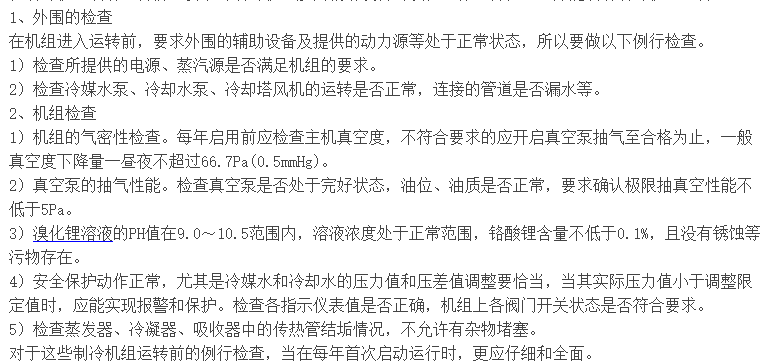 在制冷機(jī)組啟動(dòng)運(yùn)轉(zhuǎn)前,要求對(duì)制冷機(jī)組脫離輔助設(shè)備的狀況進(jìn)行一番檢查,方能啟動(dòng)制冷機(jī)組運(yùn)轉(zhuǎn)。