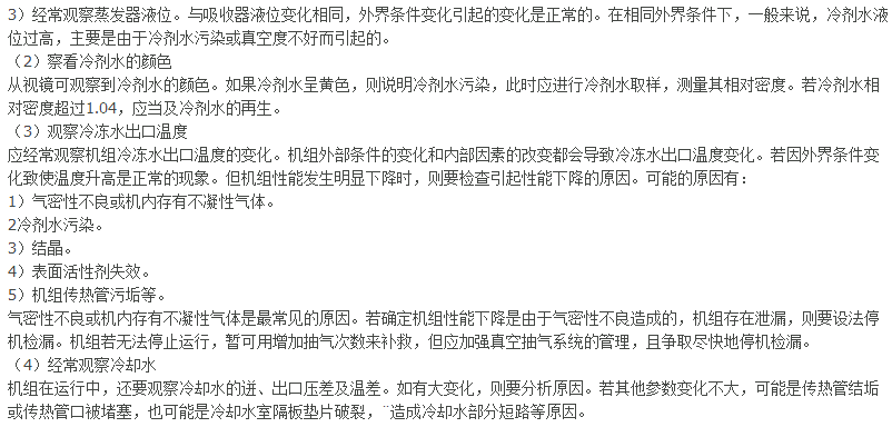 2)經(jīng)常觀察吸收器液位。引起吸收器液位變化的原因主要有:①機組真空度下降;②冷劑水污染:③溶液循環(huán)量調(diào)節(jié)不當(dāng)?shù)?。?dāng)外界條件發(fā)生變化時也會引起液位的變化,這屬于正常的變化。在運行中發(fā)現(xiàn)吸收器液位出現(xiàn)異常變化時,應(yīng)及時進(jìn)行溶液取樣分析,認(rèn)真解決。